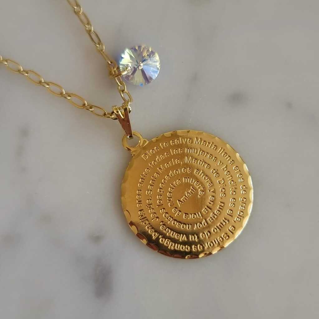 Collar delicado con medalla grabada con la oración del Ave María, acompañado de un pequeño cristal que añade brillo y elegancia. Pieza de 45 cm de largo, perfecta para usar a diario o en ocasiones especiales.