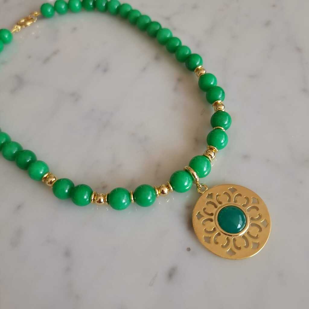 Collar de 45 cm confeccionado en jade natural con tonalidades verdes que reflejan la pureza y equilibrio de esta piedra milenaria. Complementado con un dije mandala que simboliza armonía y protección espiritual.